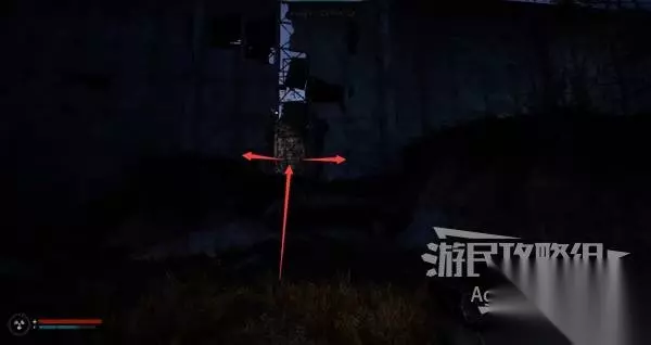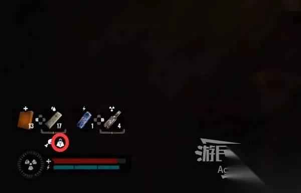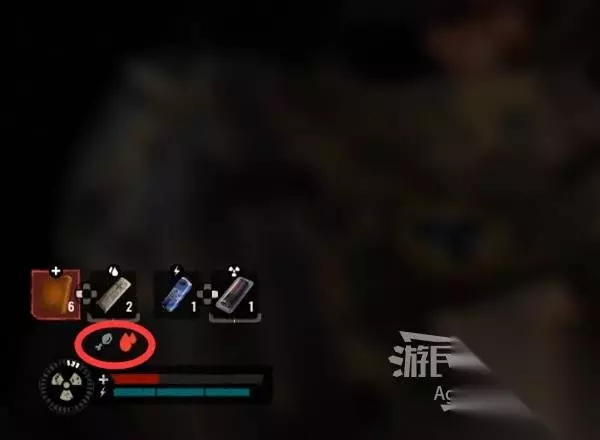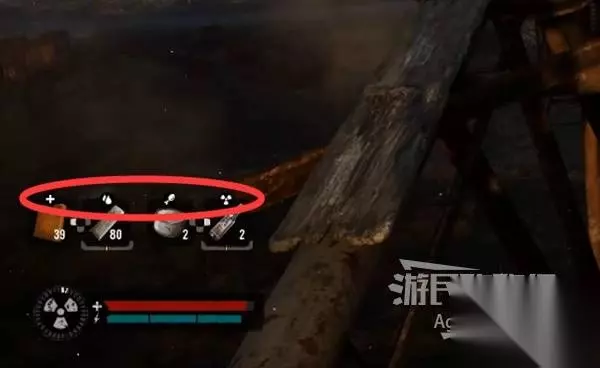 屏幕左下角,红色的是血条,蓝色的是耐力(体力)条。血条左边是辐射伤害程度。 血条上方是道具快捷栏,十字符号代表补血、水滴符号代表治疗流血状态、鸡腿符号代表缓解饥饿、辐射符号代表治疗辐射伤害、闪电符号代表补充体力。