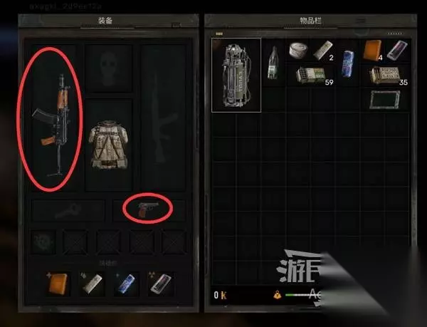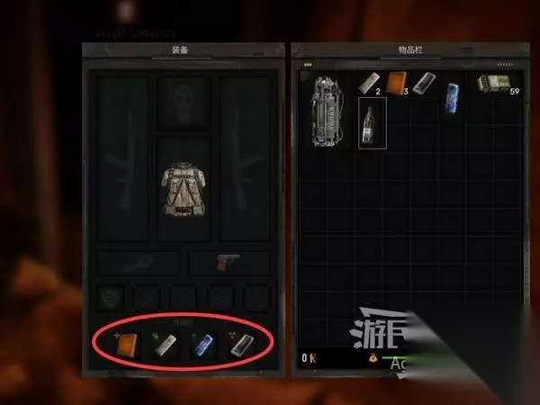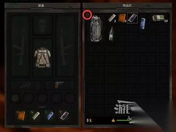 注意物品栏下面的负重值提示,当物品栏里的东西比较多时,负重值到达黄色、红色区域就会超重,会妨碍你的行动。多余的物品可以回基地卖掉或者直接扔掉。