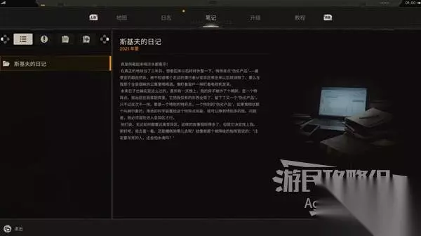去而复返(1) 游戏一开始打开笔记,可以看到主角斯基夫的日记,了解主角的故事背景。
