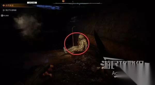 往前走又遇到一个尸体,然后是个岔路口,两条路都可以抵达目标,建议往前进入圆形通道有东西可以捡。