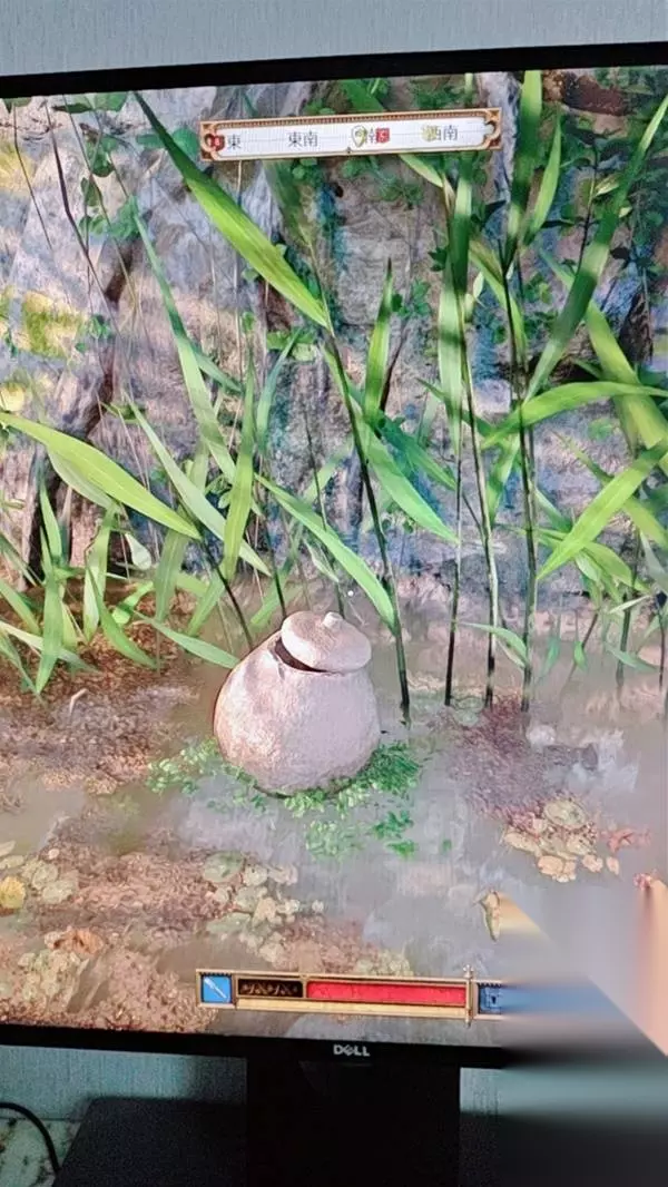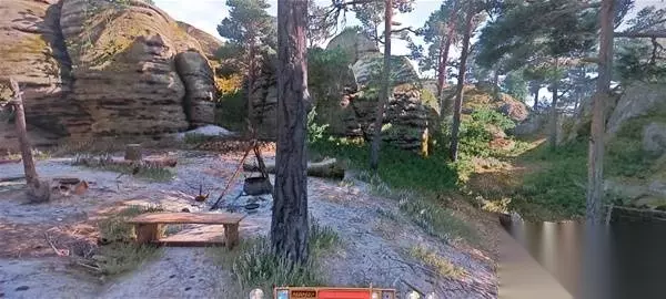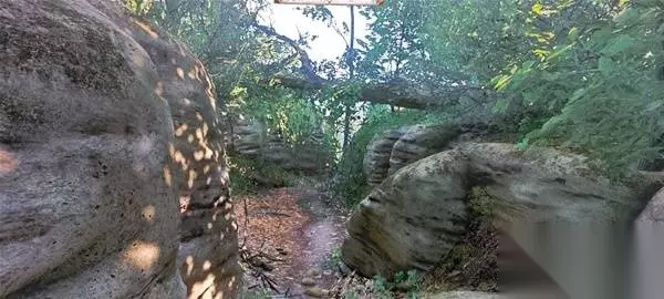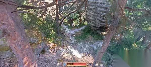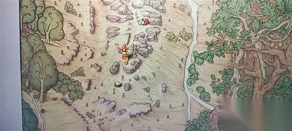 这里,到标记点后直接往左进林子能看到一条小路。然后墙壁藏宝图右上角的图案显示的是藏宝点的特征,左右两块石头上面架着一棵树,所以实际的也就是