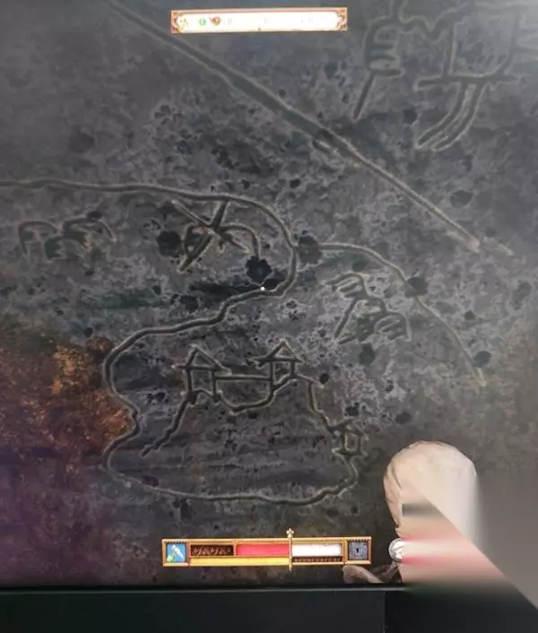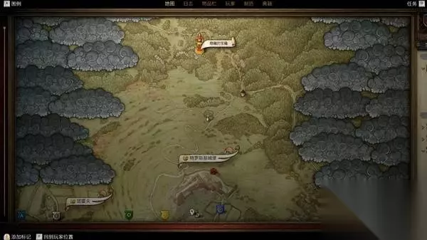 图是这样的,刚玩到这个地方的朋友肯定不清楚图是指哪里,图上的城堡很明显是山上的特罗斯基城堡,一高一低的塔楼就是少女塔和老妪塔了,所以藏宝的位置很明显是特罗斯基堡的北部大路交叉口往左的位置也就是