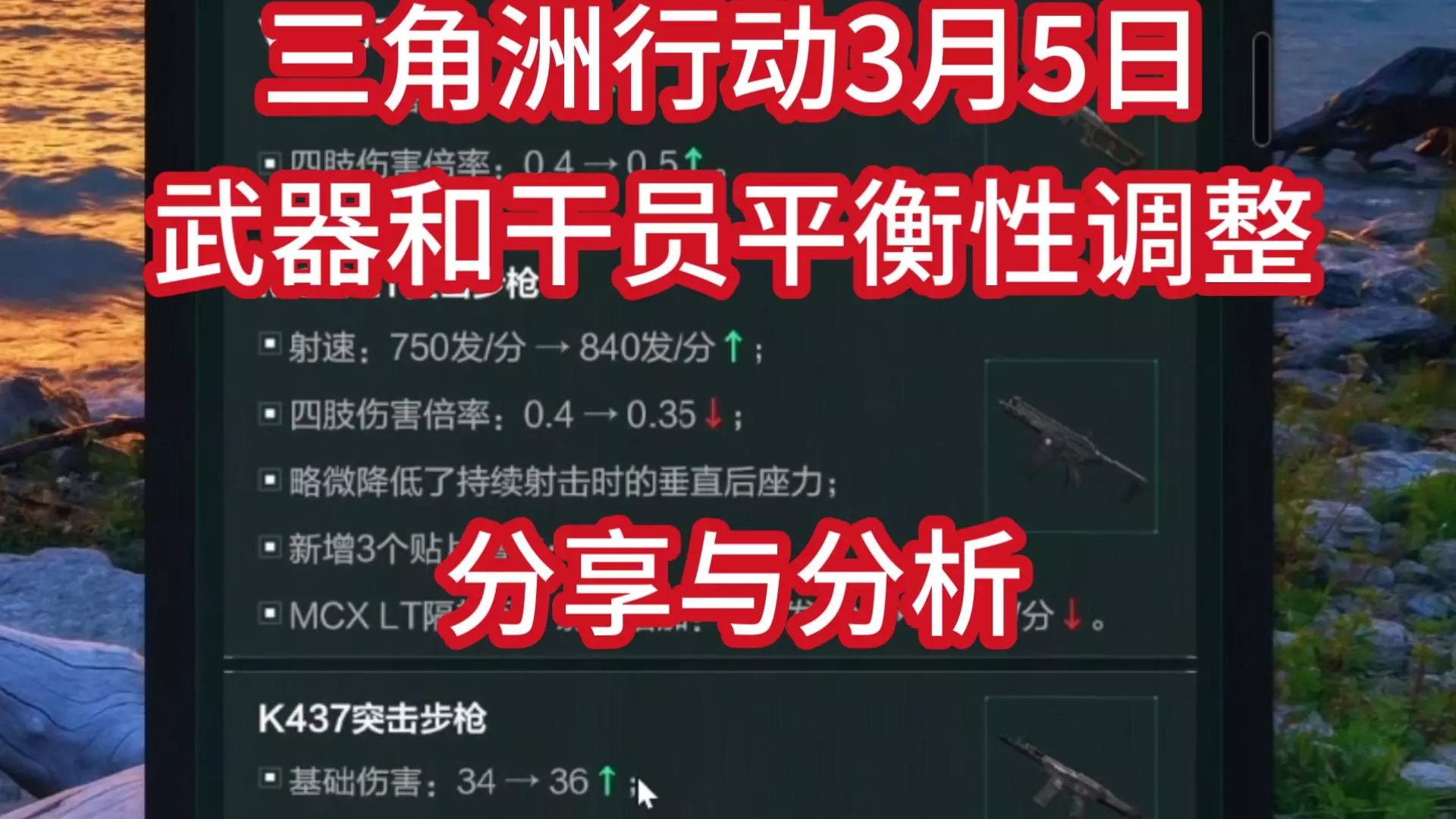 十、武器平衡性调整 1. AUG • 伤害量:41 → 40 • 镜头晃动效果降低50% 2. VSS • 伤害量:43 → 45 • 子弹速度:330m/s → 430m/s