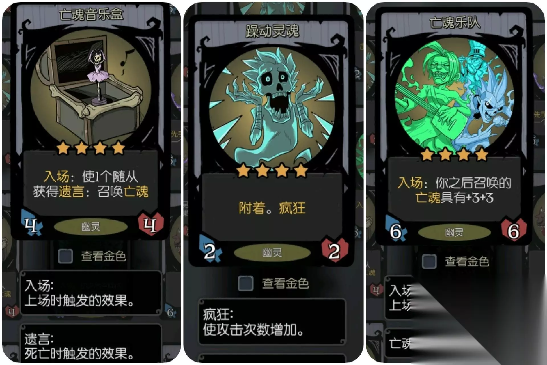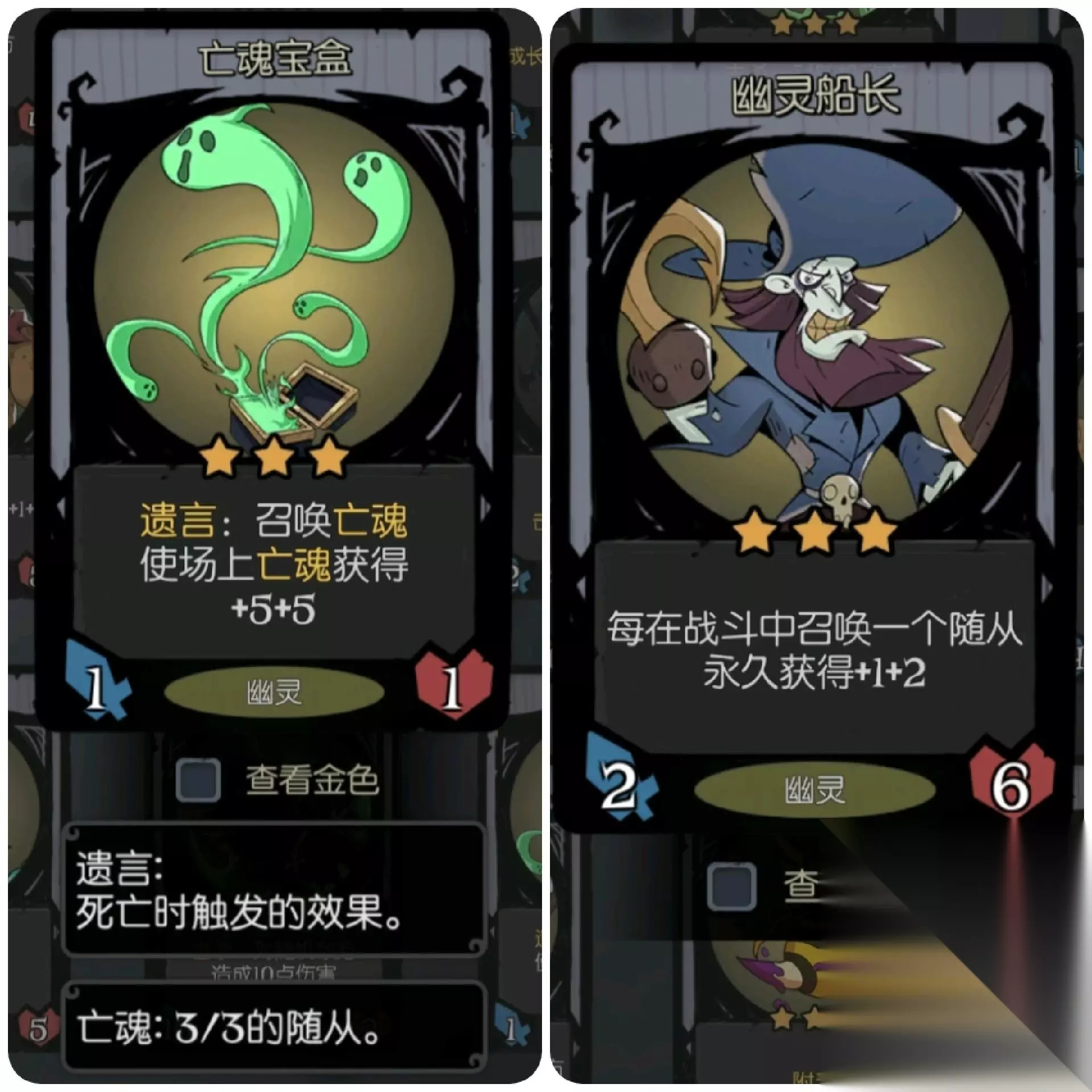 用刚刚那些技巧过渡到四星肯定是没有问题的,之后就可以继续慢慢养我们的卡组。 亡魂音乐盒施加给摆渡人,躁动灵魂给幽灵船长,亡魂乐队有就用就行(召唤的幽灵能力越强,还会出现外观上的变化,制作组用心了哈??)。 这里开始我们就要注意了,多给幽灵船长找护盾,减少受伤,穿刺横扫疯狂一类的卡。毕竟说到底这是个单核卡组,得靠幽灵船长完成最后的清扫。