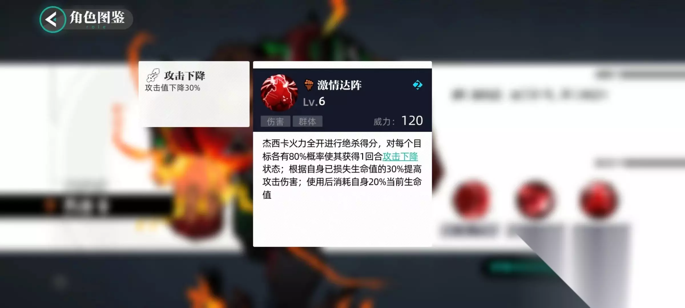 最后一个技能使得杰西卡将自身火力全部释放出来,对群体中每一个目标都造成伤害,并且使其进入到攻击下降状态,最多能下降30%攻击值,对削弱敌方输出方面有很好作用。并且根据自身已经损失生命值计算,按照比例提高攻击伤害,在此技能使用后会继续消耗当前生命值。所以该角色的很多效果都需要以牺牲血量为代价才能实现。