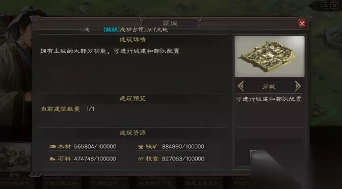 建分城的话,首先得准备好足够的资源。木材、铁矿、石料和粮食这四样基础资源各要十万,这可是个大数目,所以平时得多攒点。另外名声值得达到6000才能解锁建造功能,这可是硬性条件,没达标的话连分城选项都看不到。这些资源消耗可不是小打小闹,得提前规划好主城的资源生产,别因为急着建分城把主城给拖垮了。