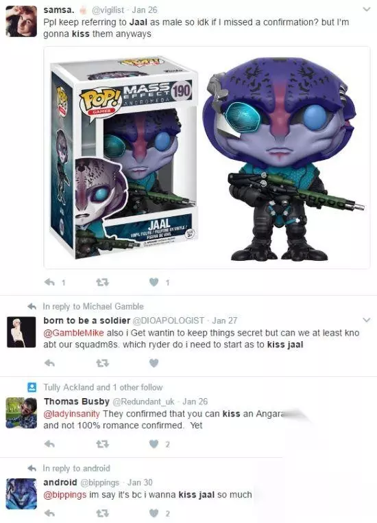 粉丝们在Twitter上询问BioWare,Jaal在游戏里是否可以被推倒,BioWare则给出了肯定的回答,不过Jaal是个男性角色,不知道当玩家通选择男性主角时,是不是也可以搅基,人们在社交媒体上也毫不掩盖对Jaal好感。