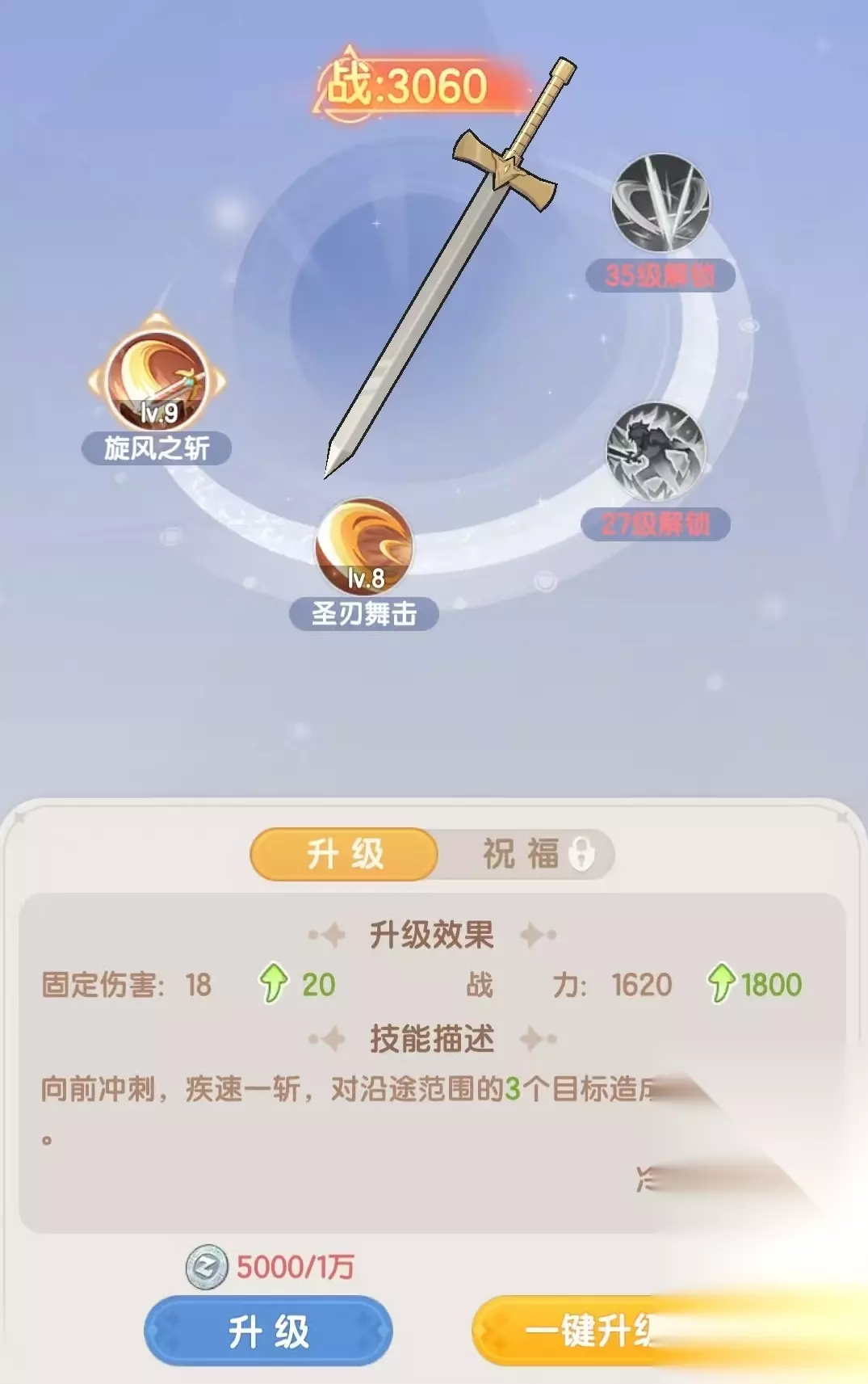主动技能方面,剑士一共有4个主动技能。第1个旋风之斩,可以向前方冲刺,然后对沿途范围内的三个目标造成伤害。第2个圣刃舞击,横扫四周敌人,对扇形区域内的三个目标造成伤害。第3个技能是以自身为圆心,对区域内的四个目标造成伤害。最后一个是绝招,可对前方矩形区域进行一次强力的攻击,对最多四个目标造成高额输出。