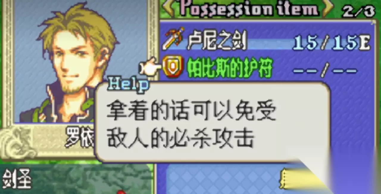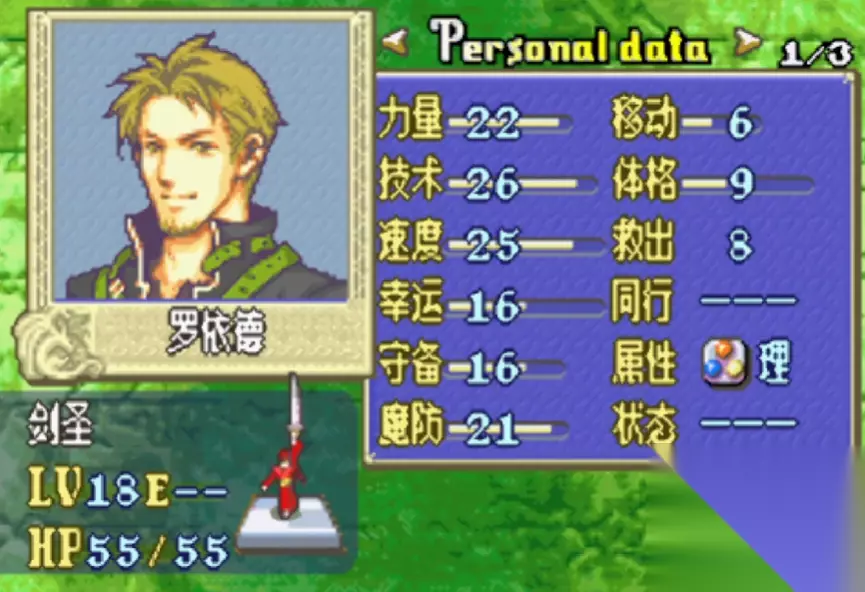 罗伊德作为一名剑圣,它的等级高达LV18,血量为55点。然后其他属性值上,攻击以及速度值更高。然后我们的目的是消灭所有的怪物,如今打到了罗伊德这关。然后还发现了几个特别的隐藏细节,首先它有着一张帕比斯的护符。之后就可以免疫敌人的必杀一击,但是却防不了我们的天马三角必杀。