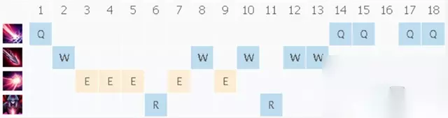 技能加点:主E技能副选W,后期点满Q技能。E技能主要效果为减速,作为无控制的打野英雄高额减速能确保gank成功率。