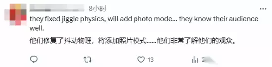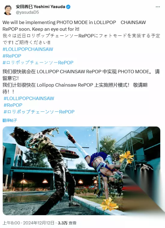 12月12日,游戏制作人安田善巳在推特上发文表示,开发组将很快在《电锯糖心:RePOP》里加入照片模式,对此,有玩家感慨道:“他们修复了‘抖动问题’,还将添加照片模式,看来他们非常了解自己的玩家。”