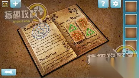 将棍子放在书中,出现图标,记住,且拿走右侧的石板。