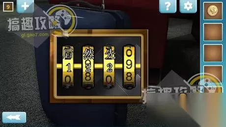 点击行李箱,行李箱的密码器,先点击第三个两次,再点击第二个两次,最后点击第一个,即可打开行李箱,取得毛巾,旁边的坐垫要记得拿。