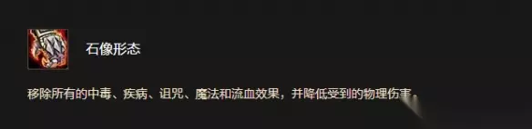 石像形态 移除所有的中毒、疾病、诅咒、魔法和流血效果,并降低受到的物理伤害。