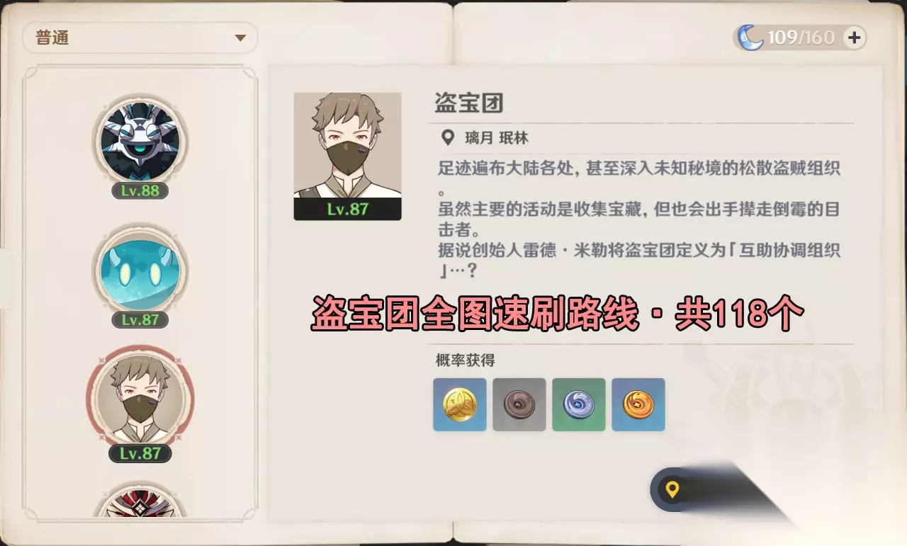 盗宝团掉落材料:寻宝鸦印,藏银鸦印,攫金鸦印 怪物刷新时间:每日凌晨4点刷新 素材用途:万叶,北斗、辛焱等角色的突破材料和技能升级材料 角色满级突破需材料:寻宝鸦印18,藏银鸦印30,攫金鸦印36 共118个盗宝团,只打扎堆的,且离传送点较近的 路线图 图一:蒙德·覆雪之路(4个)