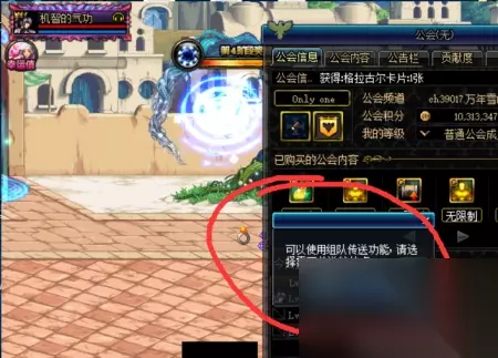今天带来一期比较实用的攻略,一个免费使用传送的办法,不过前提是你得首先加入了某个公会并且公会已经购买传送了,好了,下面教程开始。 首先ESC选择小图标打开公会栏,可以看到公会购买内容的项目就是瞬间移动传送,点击它,接着你会发现单人情况下无法组队,不过别急,动动脑筋就可以解决。