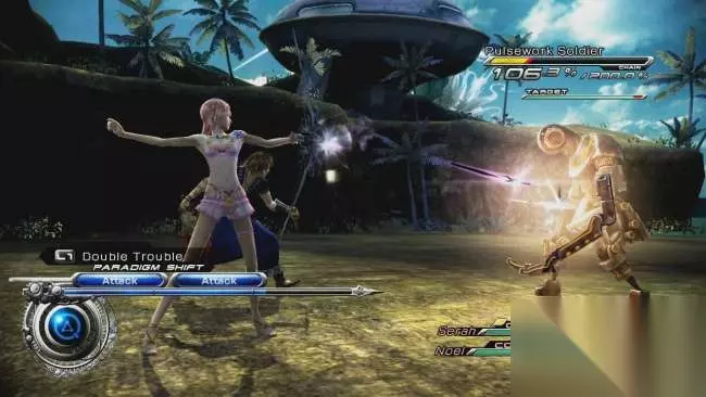 SE的剧情一直是不用担心的(即使FF15也有亮点),在水晶世界观的构架下,已经出现了FF13、FF零式、FF13-2这样的一线大作了。这个世界观里女神创造了世界,她想怎么玩就怎么玩,这也为游戏剧情设计人提供了一个瞎编乱造的合理性,不过人家编造的世界还真是深奥值得研究,单从共享水晶世界观的零式就有无限的挖掘潜力。这次的FF13-2的剧情也是从FF13的俗套一下子变得值得研究了,连FF13最后雷霆的那个别扭的微笑都被FF13-2里说成了只有塞拉一个人看到的景象,看来真真假假假假真真,就像那个生与死都混淆的瓦尔哈拉,一切似梦非梦,真实中又显得那么虚幻。看来我们要等待SE继续在FF16瞎编了,然后我们继续追随这种韵味,感受这份喜悦与痛苦。 正统RPG的操作 我想这是很大部分没有玩过的玩家都关心的问题,但是你不要指望它是一款ARPG游戏。这是正统的RPG,继承FF13的指令系统,去除了FF13的召唤兽系统,没有召唤兽除了打象龟不能一击放倒之外对其他的没有什么影响。 本作在几场BOSS战中加入了终结QTE,SE的QTE水平提高的很不错,指令时机的反应时间还是很厚道的,丝毫没有影响动作的流畅性。