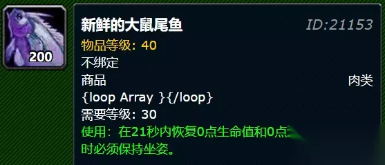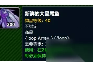 新鲜的大鼠尾鱼属性: 物品等级: 40 不绑定 商品肉类 需要等级: 30 使用:在21秒内恢复0点生命值和0点法力值。进食时必须保持坐姿。 为大家推荐:魔兽世界新鲜的夜鳞鲷鱼哪里多-新鲜的夜鳞鲷鱼钓取位置分享