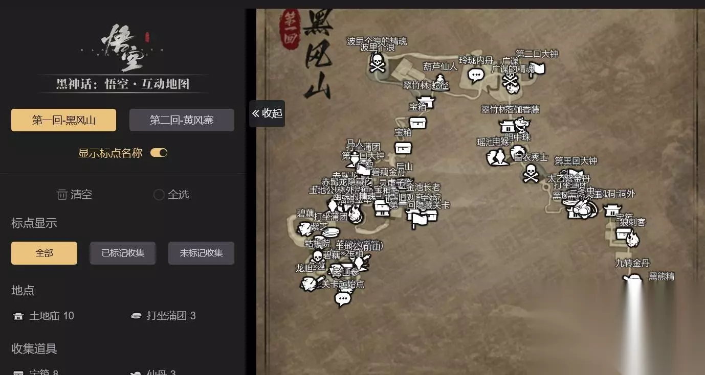 黑神话悟空地图互动工具可以帮助玩家们快速探索地图,收集地图上的材料、资源,寻找boss的位置等。下面为大家整理了一些比较好用的黑神话悟空地图查询工具,玩家们可以通过以下连接来查看地图的内容,快速寻找自己想要的东西。 【黑神话悟空性能测试工具】 黑神话悟空地图互动工具分享 1、互动地图工具 全收集互动地图:点此前往>>> 使用方法:在左侧选择回目,然后就可以查看对应场景地图。 选择下方的收集道具或者是物品,就可以在地图上显示出标注位置了,按照地图位置去收集即可。