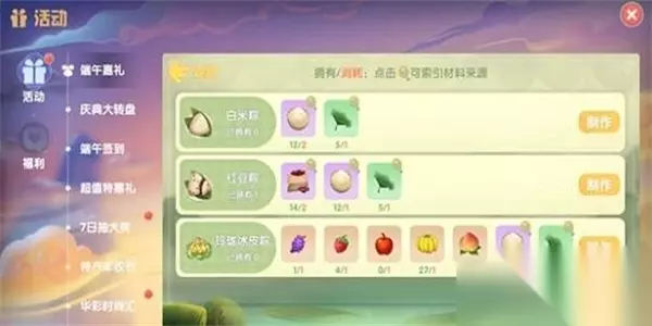 摩尔庄园粽子怎么兑换 方法如下: 端午活动:一起包粽子 活动时间:6月11日5点 — 6月17日24点,共七天 兑换所需要的材料: 白米粽:糯米,粽叶 红豆粽:红豆糯米,粽叶 玲珑冰皮粽:苹果、香蕉、草莓、葡萄、桃子、糯米,粽叶
