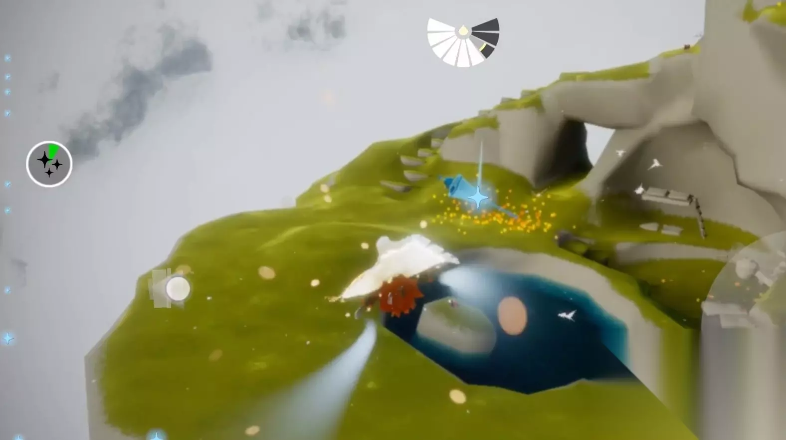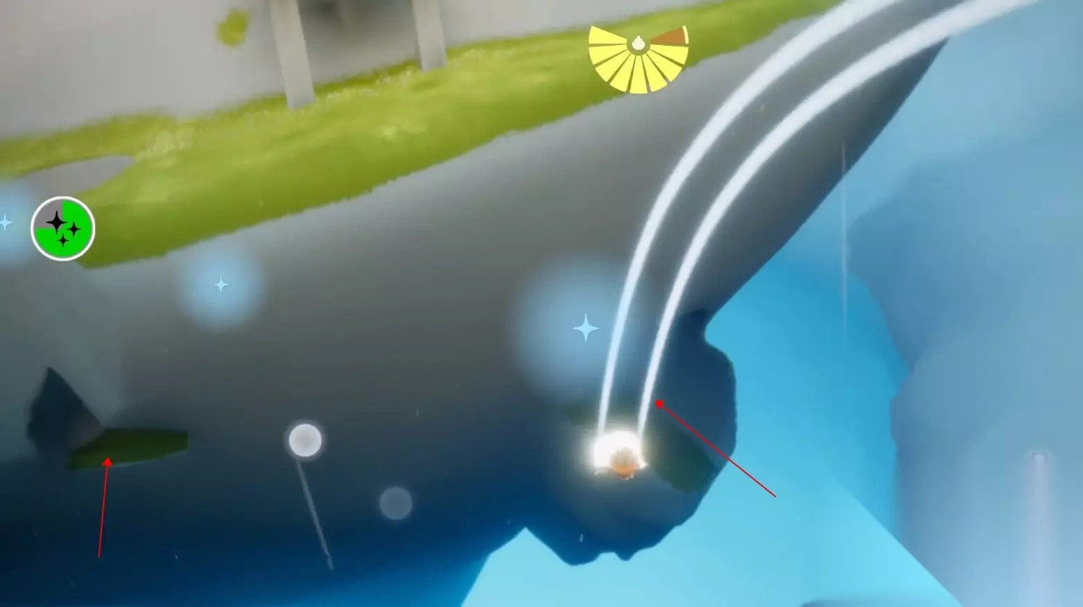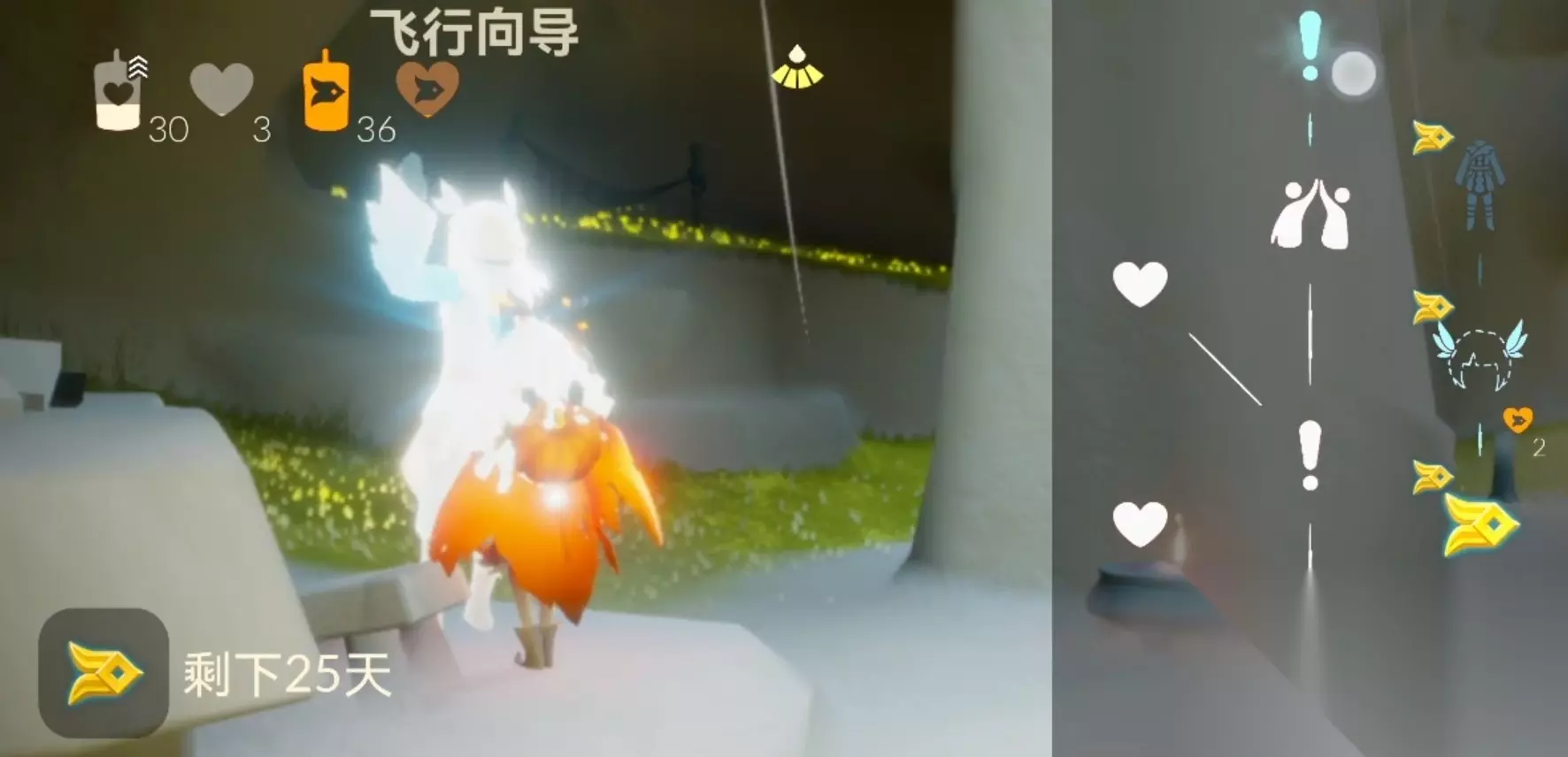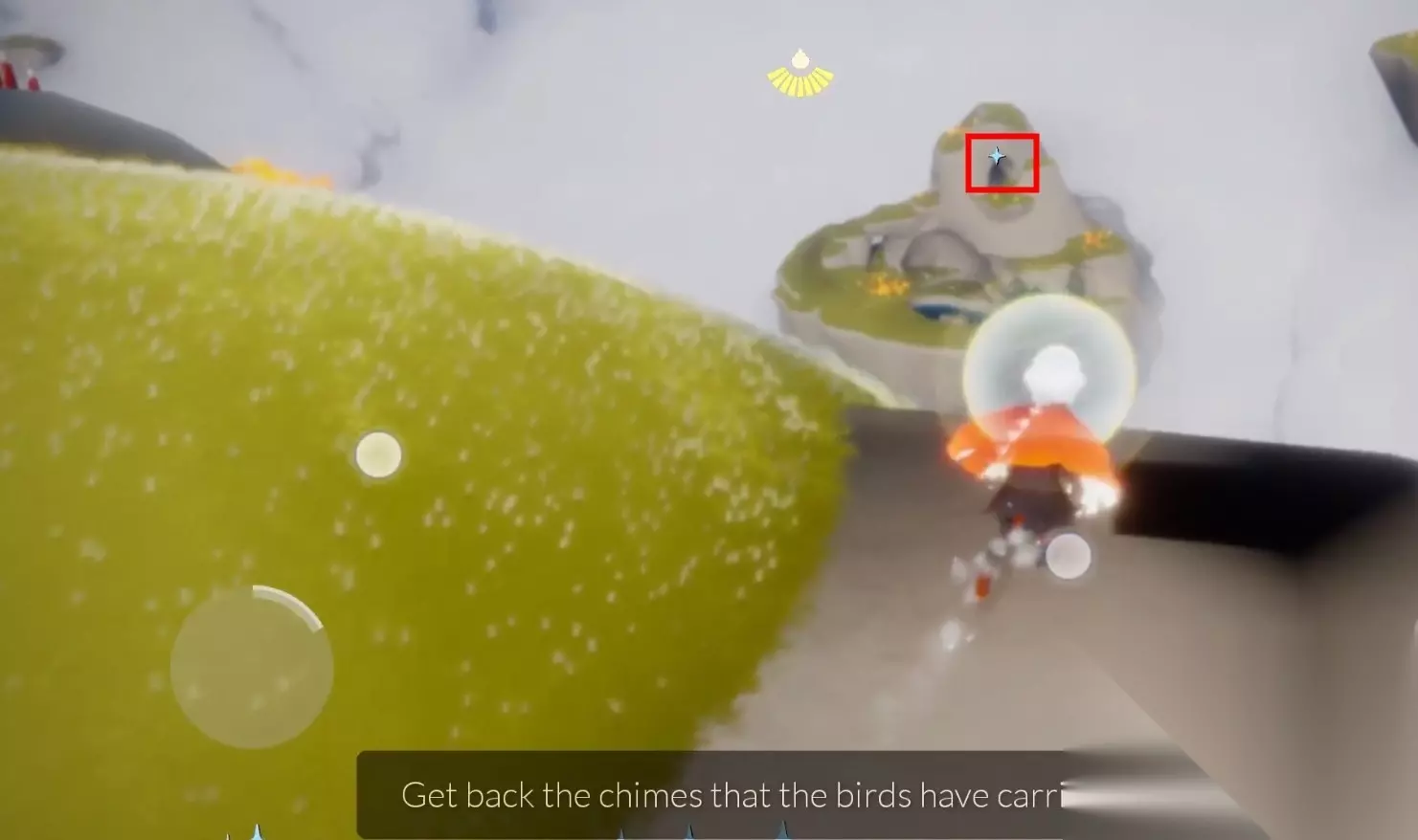 2、风铃的位置主要分两片区,风之路里面有一部分(6个,大多都贴着云朵),照着星星所在的方向飞就可以了; ps:淡蓝色星星在云朵之间不太明显,飞慢点就能看到了