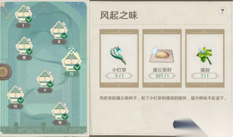 原神寻味北地第四天调料配方名为风起之味,看名字就知道这蒲公英籽是少不了了,下面小编就为大家分享原神寻味北地第四天风起之味配方攻略,不会做的小伙伴们赶紧来学习吧! 原神寻味北地第四天风起之味配方攻略 1、风起之味配方:小灯草+蒲公英籽+薄荷。风吹来的蒲公英种子,有了小灯草和薄荷的陪伴,提升鲜味不在话下。