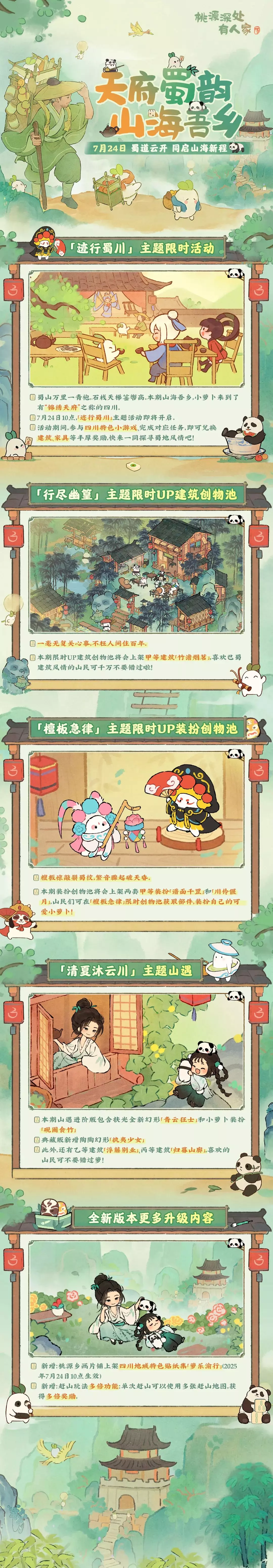 7月24日10点,一同探寻蜀地风情!活动期间完成对应任务,即可兑换活动限定建筑、家具、头像等奖励哦!同时,限时剧情「蜀川归客」也将开启,同货郎一道,沿着盘桓蜀道入川游历,开启一场寻心之旅吧!