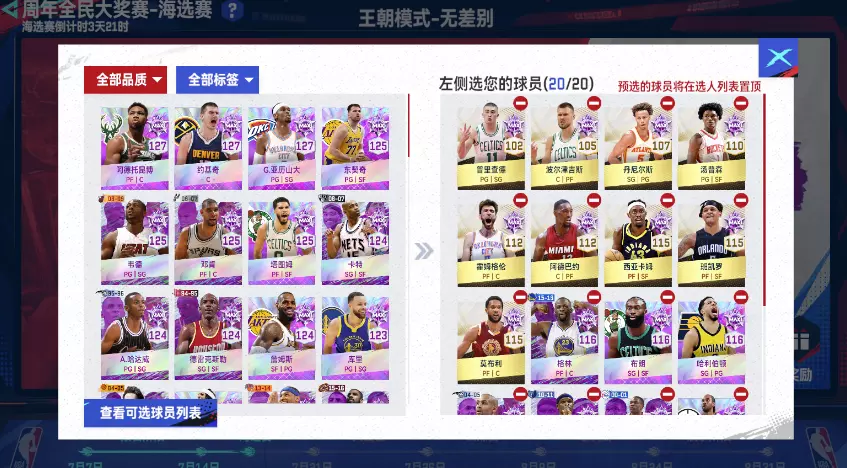 王朝赛中,选手们可在对局前预选球员,编辑自己的常用阵容。预选球员将出现在选人列表最前。王朝赛中,选手可预选20位球员,原本的可用球员列表入口放在了预选球员中。