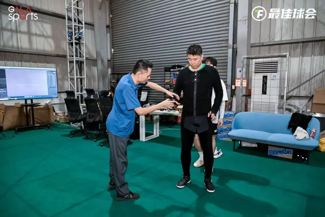 在工作人员的指导下,董方卓穿上了特制的动作捕捉服,瞬间完成“变身”踏入了这片数字化的“第二赛场”。一切从标准的A-pose校准开始。紧接着精准射门、主罚任意球、头槌攻门……每一个关键动作,都展现着职业球员的规范与严谨。