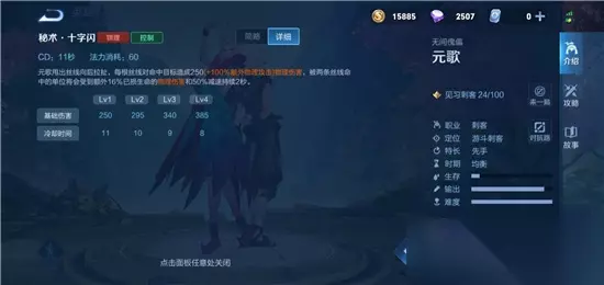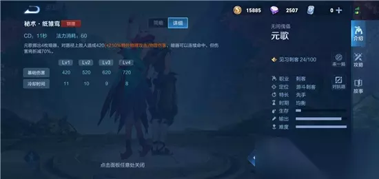 终极技能:秘术·散 元歌立即消失,并在短暂延迟后出现在范围内的另一位置;第二形态:傀儡向指定方向冲锋,对路径上的敌人造成100%物理加成的物理伤害;在束缚状态下该技能会立即将控制权转向本体; 冷却值:28/24/20 消耗:100 技能分析:可以配合1、2技能使用