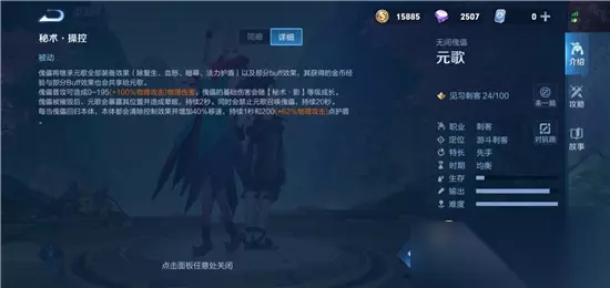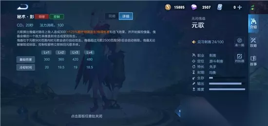 1技能:秘术·影 元歌将傀儡向指定方向掷出,对路径上敌人造成300/360/420/480(+125%额外物理加成)点物理伤害和击飞效果,并开始操控傀儡,傀儡会模仿一个敌方英雄直到攻击或者受到攻击;傀儡位于元歌900范围内时元歌会进行自动攻击;傀儡超过元歌2500范围5秒后会自动销毁;傀儡一旦死亡或销毁控制权将立即转回元歌本体;第二形态:立即收回傀儡,并对路径上的敌人造成300/360/420/480(+125%额外物理加成)点物理伤害和击飞效果; 冷却值:20/19.5/19 消耗:100 技能分析:可以配合被动技能,作为主点技能