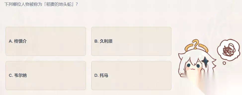 原神派蒙的十万个为什么答案是什么 派蒙的十万个为什么答案大全 相关攻略 > 下列哪位人物被称为「稻妻的地头蛇」? A.格慎介 B.久利须 C.韦尔纳 D.托马 正确答案:托马