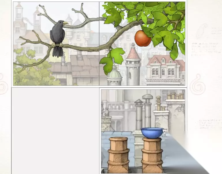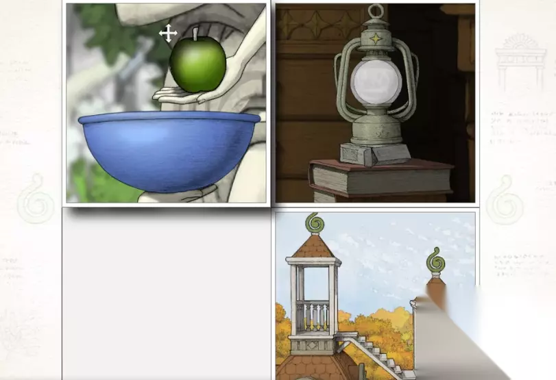 这里是需要配合上童年时期的场景,将笔画还原,在那里会看到一个带有绿眼珠的笔画,这里将眼珠子与神像手中的苹果重合,它就会变成绿色的,然后各位就可以将这个苹果收集起来了。然后就会呈现出整个花园的场景。后面就会是新的任务,这次的首个场景会是在一个双子楼的前方,后面会是个在傍晚的场景,那里天上会有个光标。后面会有一盏灯,这个灯的位置是在主角的家中,随后将会看到这个房间的全貌,里面有很多的线索能获取。
