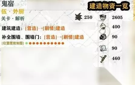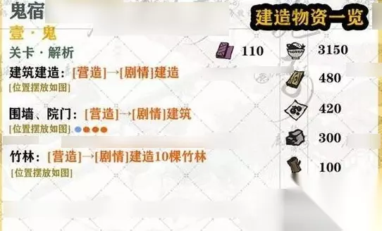 江南百景图鬼宿共有7关,玩家只需完根据指示进行建造即可通关,由于很多小伙伴不知道具体怎么过,下面小编将为大家详细介绍一下,感兴趣的赶紧来看看吧。 江南百景图鬼宿通关攻略 一、第1关 1、建筑建造:[营造]→[剧情]建造。 2、围墙、院门:[营造]→[剧情]建筑。 3、竹林:[营造]→[剧情],建造10棵竹林,完成后按照下图位置摆放即可。