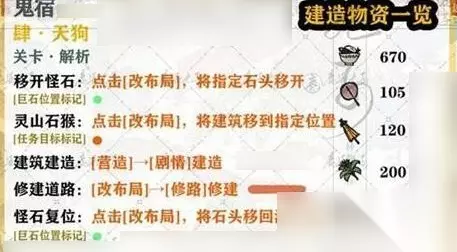 四、第4关 1、移开怪石:点击【改布局】就能将指定石头移开。 2、灵山石猴:点击【改布局】,即可将建筑移到指定位置。 3、建筑建造:营造→剧情建造。 4、修建道路:改布局→修路修建。 5、怪石复位:点击【改布局】,将石头移回洞口门口。
