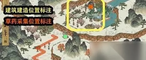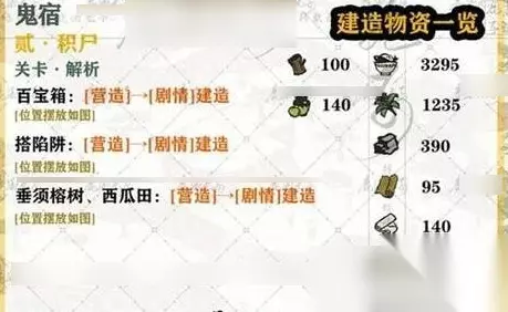二、第2关 1、百宝箱:[营造]→[剧情]建造。 2、搭陷阱:[营造]→[剧情]建造。 3、垂须榕树、西瓜田:[营造]→[剧情]建造。 4、位置摆放如图所示。
