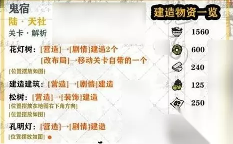 六、第6关 1、花灯树:营造→剧情建造2个。 2、建造建筑:营造→剧情建造。 3、松树:营造→装饰建造,位置摆放在地图右下角方向。 4、孔明灯:营造剧情建造。
