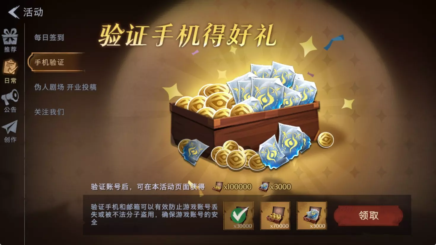 → 游戏主界面点击 【活动】-【日常】-【手机验证】