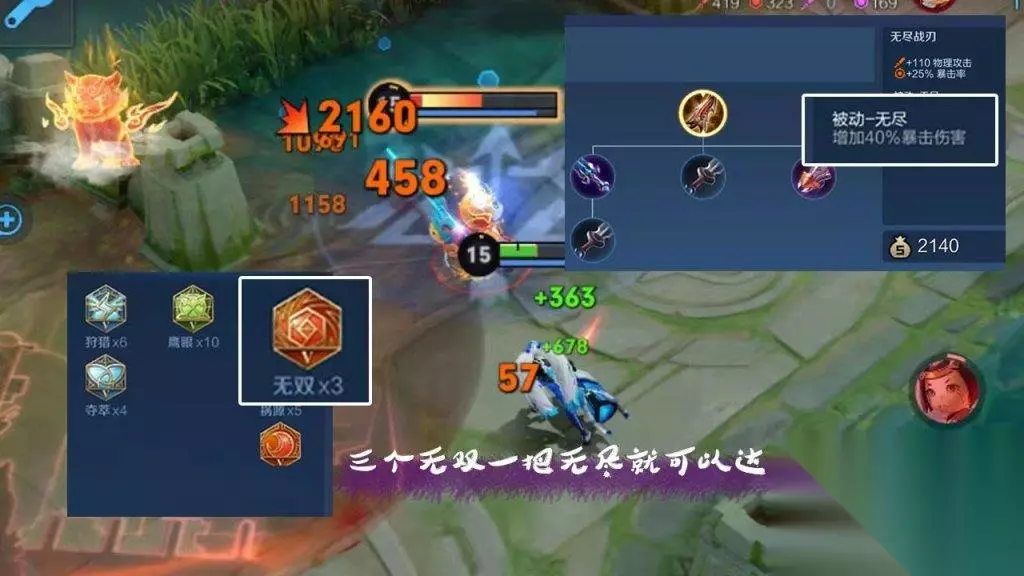 把暴击效果增加了一个上限,上限为250%,而天生的暴击效果是200%,出了必出的无尽以后,暴击效果为240%,再加上红色的无双铭文3个就可以到达最高的暴击效果了。所以我们玩有暴击的英雄带3个无双就可以了,带多了也是浪费。 打野刀的小知识 现版本的打野刀都有一个被动叫作“游击”,这个游击效果是不会分享队友经济的。但是要注意是自己单独和队友在一起的时候,如果辅助在的话,那么系统活默认先给辅助这个效果。所以如果打野想要蹭经济可以让他单独来,不过打野也要注意,你可以蹭经济,但是不要蹭经验,毕竟法师需要4级才能有更高的战斗能力,所以清线要在法师可获得经验的范围蹭,别搞得人家法师经验上不去,到时候游戏就很难和平进行了。
