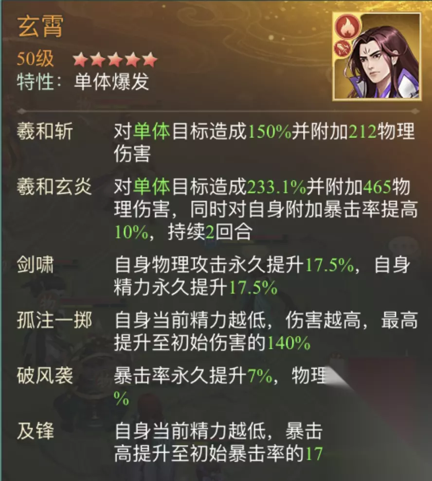 3、玄霄 玄霄放5号位,玄霄被动“孤注一掷”以及“及锋”,当自身精力越低时,造成的伤害以及暴击率就越高,中后期在镇狱明王牺牲之后,利用敌方重楼以及武林人士压低自身精力,绝技可直接打在重楼身上,造成高额伤害。