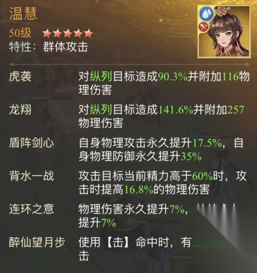 5、温慧 温慧放9号位,温慧普攻“虎袭”对纵列目标造成伤害,攻击命中时,可触发被动“醉仙望月步”有21%概率造成连击,打高分重要伙伴之一,需要普攻多连击,但因敌方李忆如的存在,对面阵容的武林人士生存率较高,因此想要有效提高总伤害,那就要让绝技“龙翔”可以打到右侧一列武林人士身上。