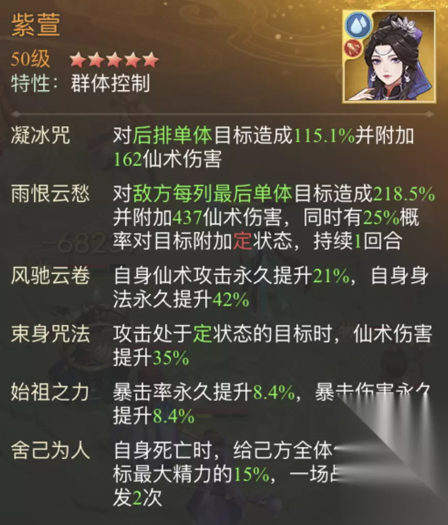 4、紫萱 紫萱放8号位,紫萱绝技“雨恨云愁”对敌方每列最后单体造成伤害并有25%概率对目标附加定状态,若定住最后一排右侧武林人士,可保阿奴多打一次普攻,提高总伤害。