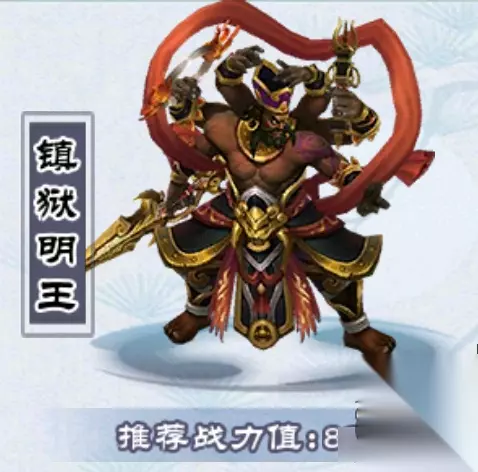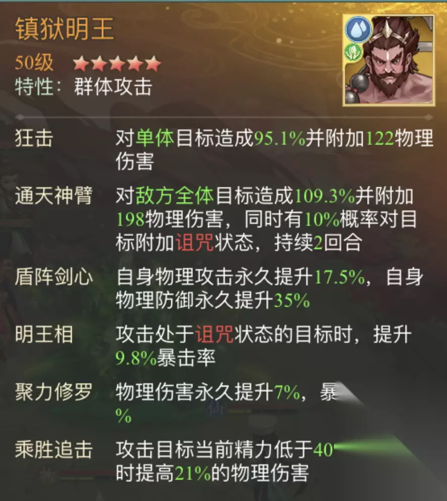 2.阵型角色特点分析 1、镇狱明王 镇狱明王放2号位,镇狱明王绝技“通天神臂”对敌方全体目标造成物理伤害,同时有10%概率对自标附加诅咒状态,被动“明王相”诅咒效果(暴击+9.8%)持续2回合,可使后续所有伙伴提高暴击率。