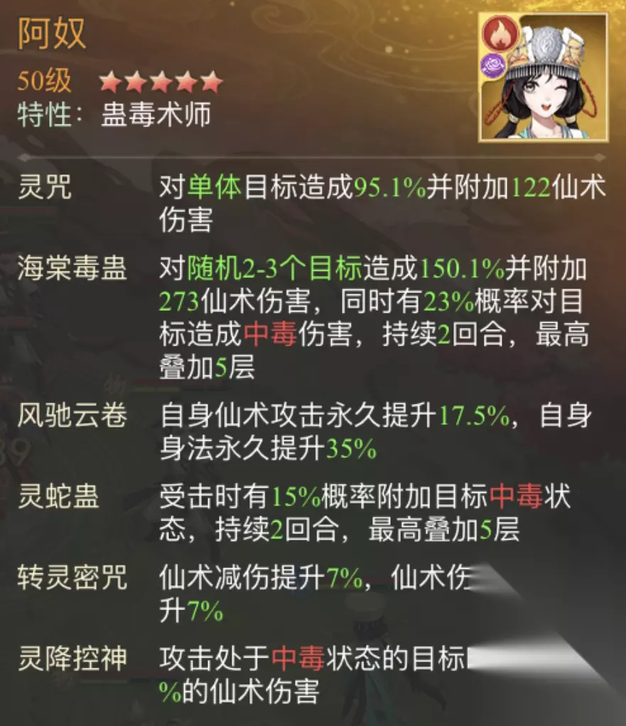 2、阿奴 阿奴放3号位,阿奴绝技“海棠毒蛊”对随机2-3个目标造成仙术伤害,同时有23%概率对目标造成中毒效果,持续2回合,最高叠加5层,被动“灵蛇蛊”自身受到伤害时有15%对目标附加中毒效果以及另一被动“灵降控神”攻击处于中毒状态的目标时,提升35%的仙术伤害,因此适合放在前排。