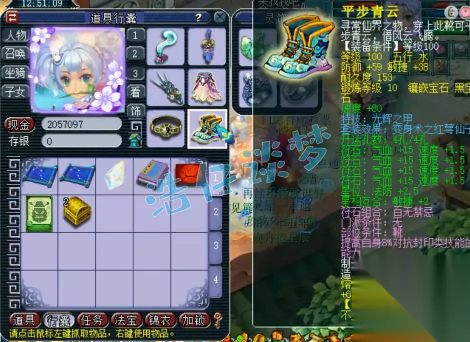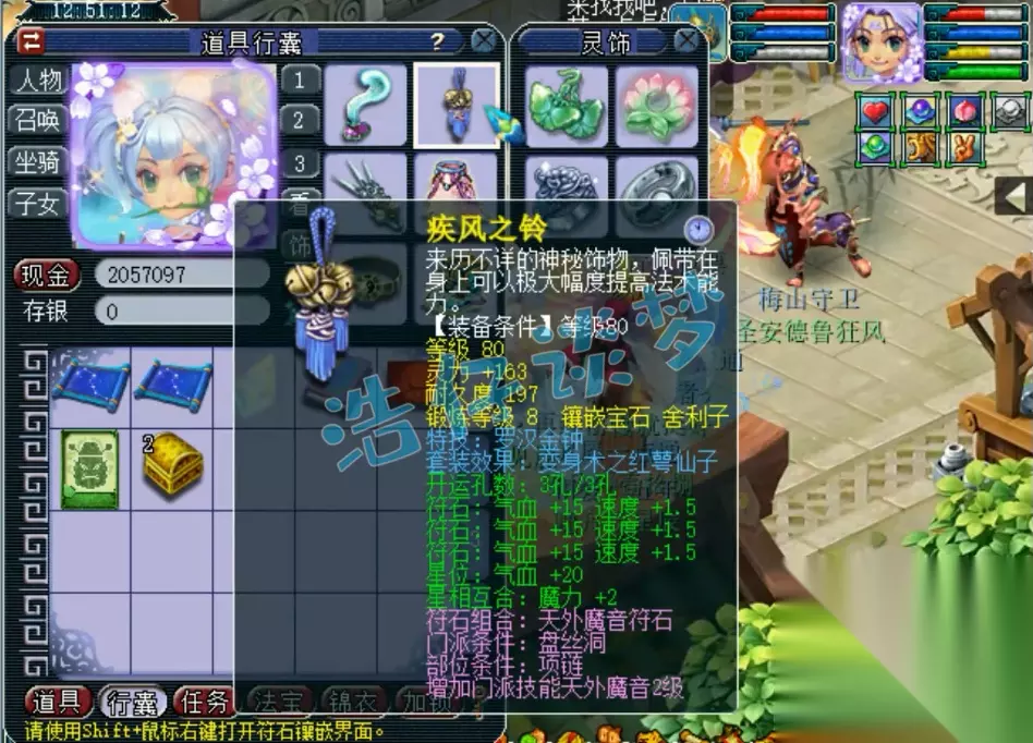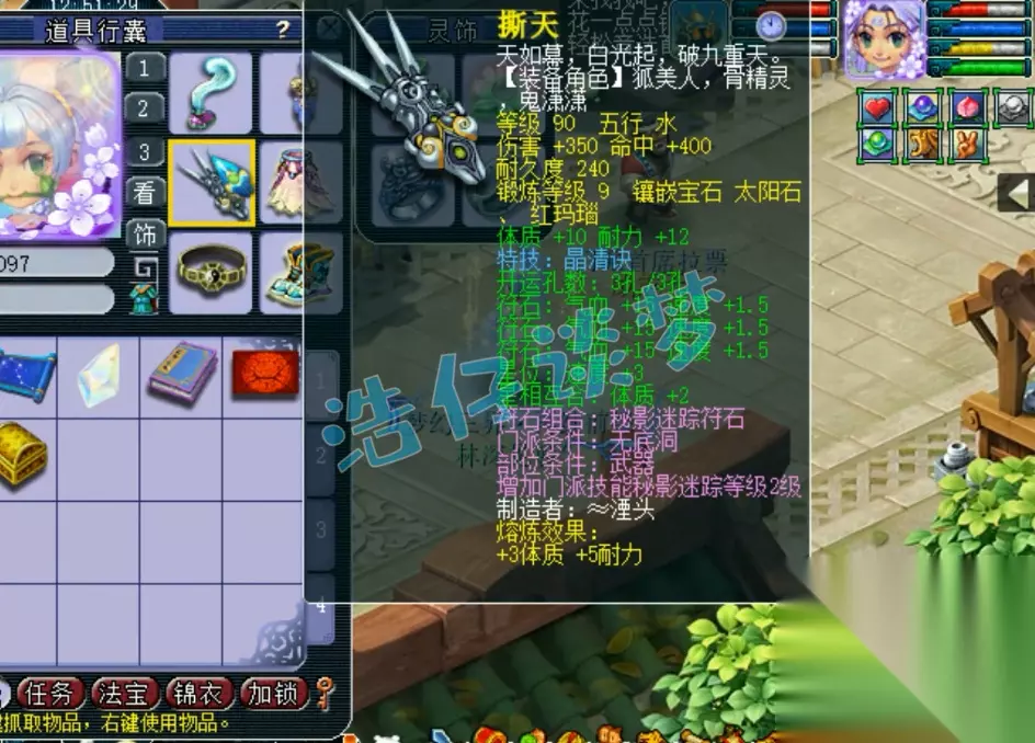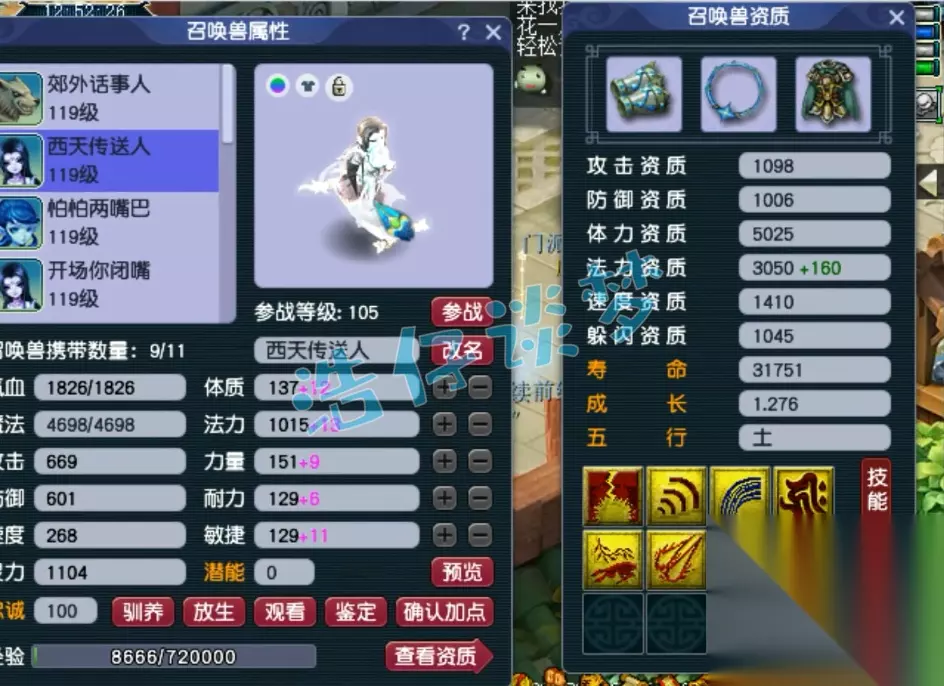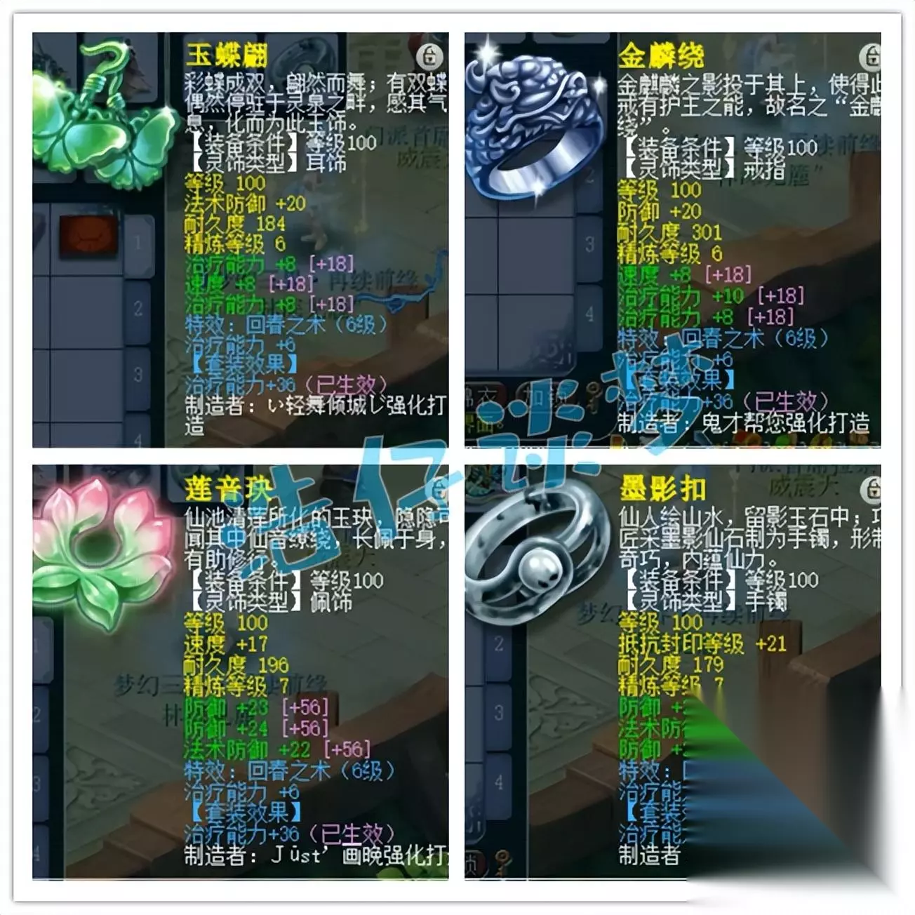 戒指和耳饰下排都是双治疗一速度,佩饰和手镯下排都是双防御一法防,特效选择了6级回春之术,一口血回复2000多,还是很舒服的!