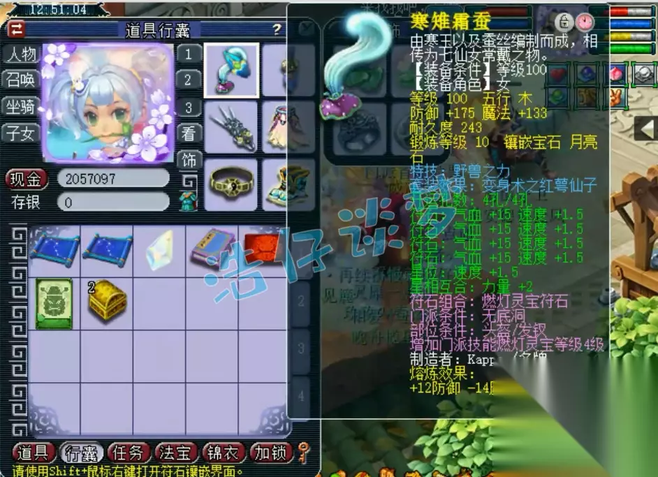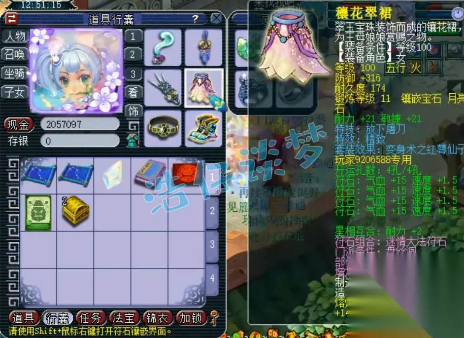 100级精致放下屠刀红萼仙子套女衣,耐敏双加42,打了11锻月亮石。