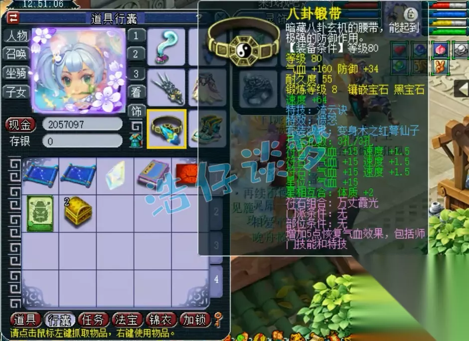 80级愤怒流云诀红萼仙子套腰带,打了8锻黑宝石,环装属性有点欠缺!