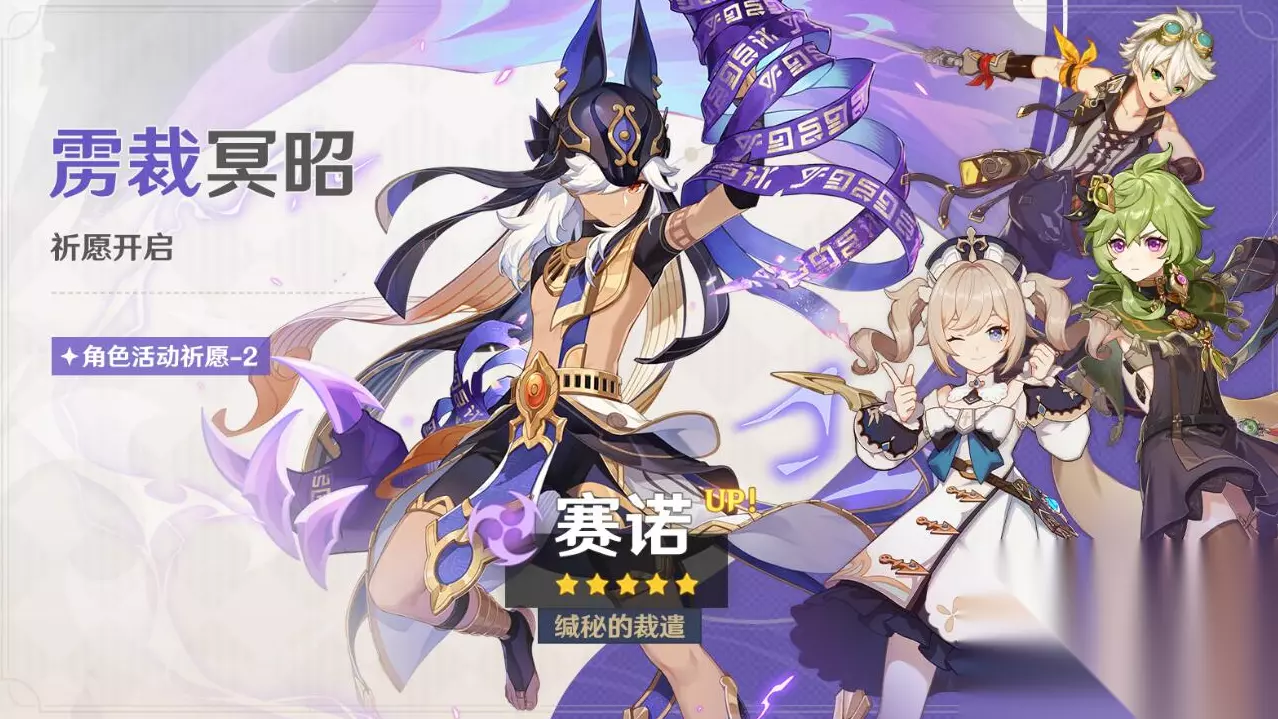 《原神》3.5版本UP池四星角色 四星陪跑 班尼特、芭芭拉、柯莱 祈愿说明 〓祈愿时间〓 3.5版本更新后 ~ 2023/03/21 17:59 〓祈愿介绍〓 ●活动期间,限定5星角色「缄秘的裁遣·赛诺(雷)」「炽鬃之狮·迪希雅(火)」的祈愿获取概率将大幅提升! ●活动期间,4星角色「命运试金石·班尼特(火)」「闪耀偶像·芭芭拉(水)」「萃念初蘖·柯莱(草)」的祈愿获取概率将大幅提升!