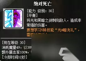 平衡状态下,夜光法师的技能输出普遍比较高(例如下方的死亡之刃、绝对死亡,平衡状态下,前期利用该状态尽可能多用死亡之刃多清怪,输出很高,范围也很大):