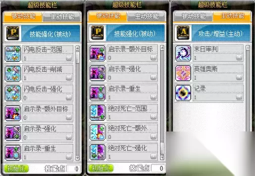 3、超级技能部分: 主动:末日审判、英雄奥斯、记录 被动:绝对死亡-范围提升、绝对死亡-强化、闪电反击-范围提升、闪电反击-削减、启示录重生